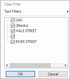 Filter To select the choices to use as criteria, click to check the desired box or boxes and then, click OK. Note: Advanced filtering options are available by clicking Text Filters. |