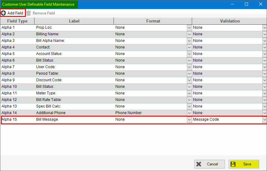 Customer user definable fields can be set up to hold a message. Messages entered here will be displayed in the user definable section of the Customer view and can be included in the individual customer's statement (setup required) in addition to the other billing messages that are available to print on all statements. In the example below a customer user definable field is created to hold Bill Message. The message assigned to this account is that the meter needs to be replaced.