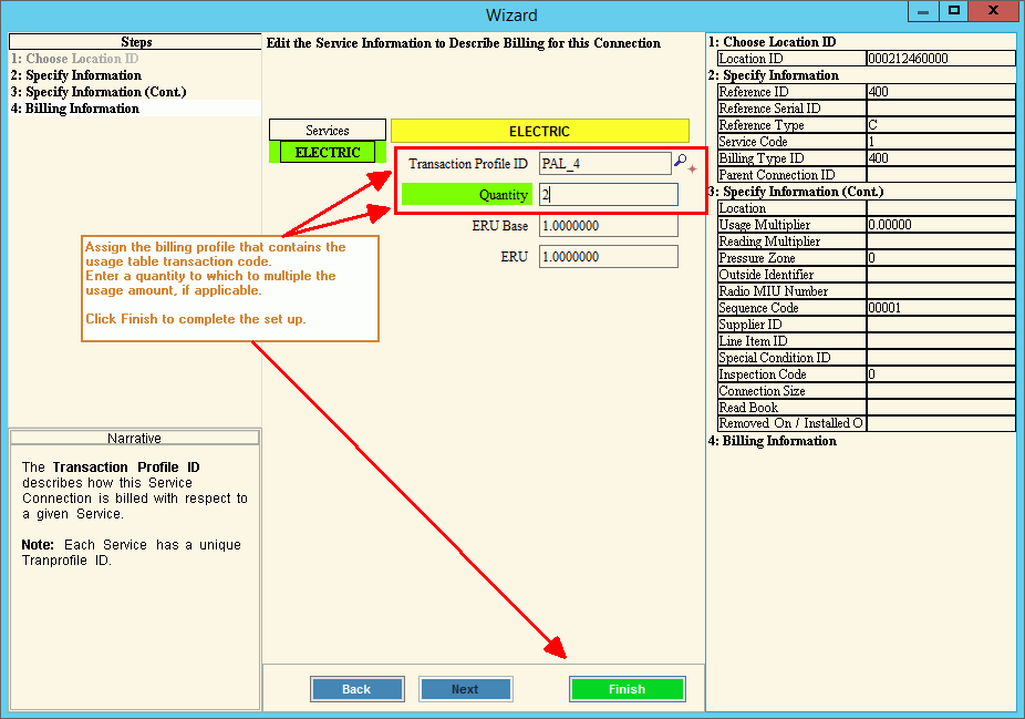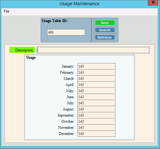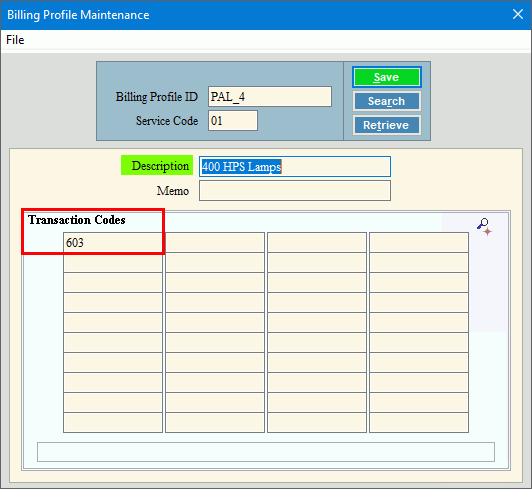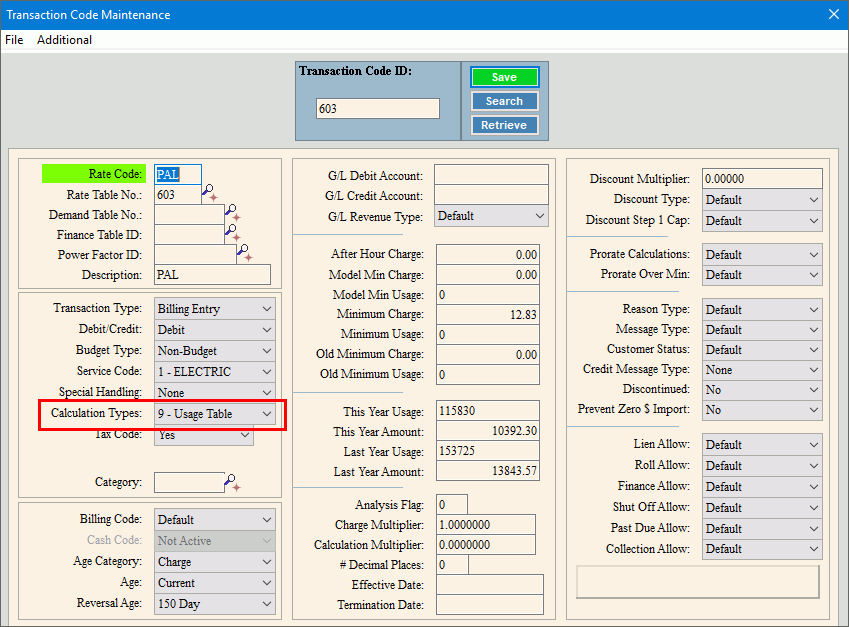 A transaction code with a calculation type 9 - usage table is used to calculate a billing amount using a value from a usage table. This type of calculation is used to bill a service or connection as usage equally each billing period and is used when there is a component that doesn't have a meter. This can be used to bill items like street lights, private lights or to bill demand charges. Below are directions on how to set this up.