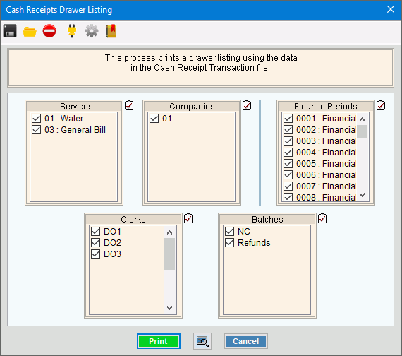 Use the Cash Receipts Drawer Listing to generate a listing of the cash and checks that have been recorded but not yet posted to customer accounts. The list consists of the cash and checks that are in the cash file. The Drawer listing can be generated by clerk and batch. These options can be handy when clerks are trying to reconcile their drawers.