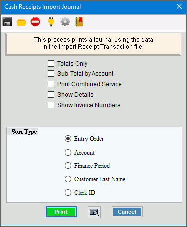 Use the Cash Receipts Import Journal to list all cash receipts import transactions in the Cash Import file (CASH-IMP). Use this journal to proof the transactions before posting them to the Daily Work cash receipts transactions file.