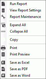 The report grid offers right-click options for the highlighted report as well as options for printing and exporting the report list.