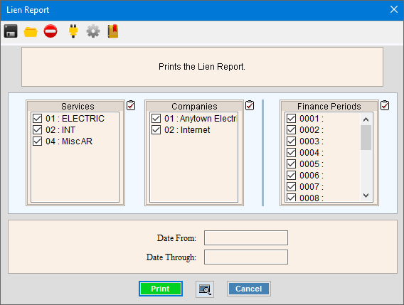 Use the Customer Lien Report to review outstanding customer liens for each service, as well as, the associated lien details. You can specify the services, companies, finance periods and a specific time period to include on the report.