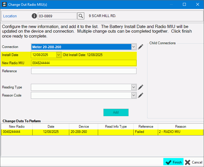 To add the radio MIU to the connection, click Add. The radio MIU displays in the Change Outs to Perform list at the bottom of the screen. If there are MIUs that need to be changed, select the next radio MIU to change and repeat these steps until all MIUs are changed. |