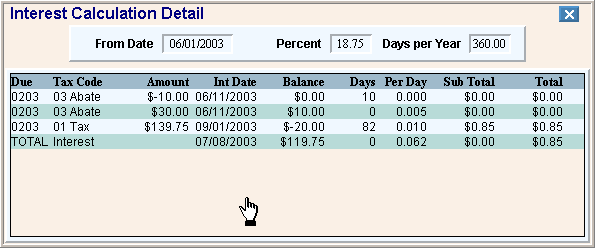 To display the Interest Calculation Detail Area, double-click an interest transaction in the Tax Detail Area.