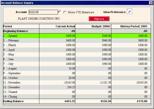 Use the Detail Window to view a comparison of Period Balances from different data sources for a specific Account Number. The table following the window example describes the Detail Window for the Account Balance Inquiry.