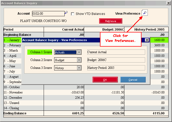 Use the Account Balance Inquiry to display Period Balance information by account so you can compare up to three different data sources at a time including the current Chart of Accounts, history, and budgets. For the specified Account Number, there are three comparison columns with each row representing a Period.