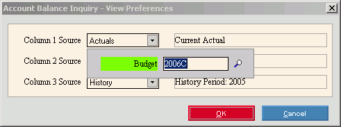 Use the View Preferences Window to specify the source data to display in the columns for comparison. For each column, you can specify one of three sources of data including actuals, history, or a budget. You can mix and match the sources as desired; for example, you can display three different budgets in the comparison columns. The table following the window example describes the View Preferences Window for the Account Balance Inquiry.
