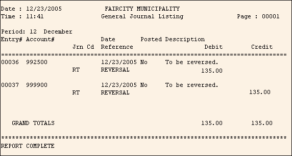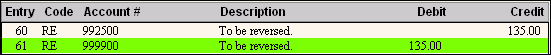 In December run Create Reversing Entries, entering November as the Reversing Entry Period and December as the Create Entries for Period. The program automatically creates the RT transactions to reverse the RE transactions. Now Account #992500 is debited and #999900 is credited.