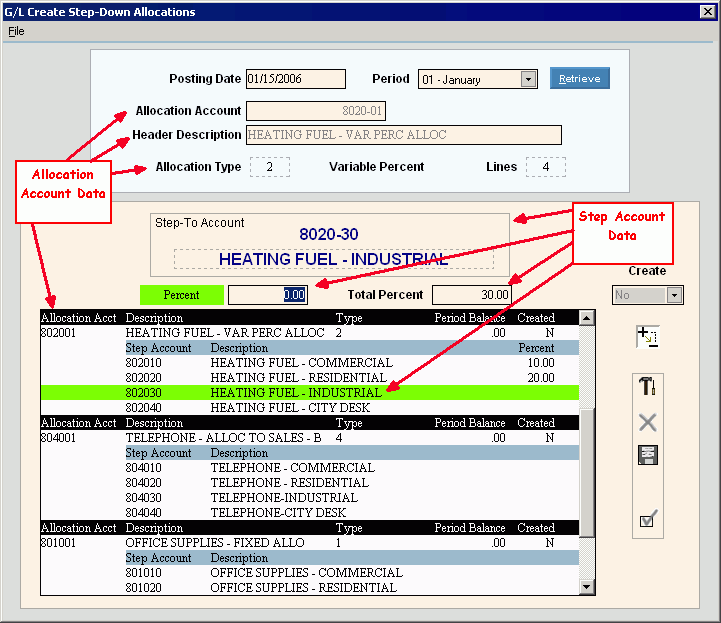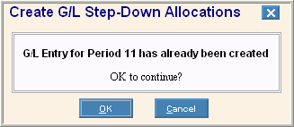 Use the Create Step-Down Allocations routine to generate the journal entry transactions for the predefined allocations. An Allocation Account, which is created during Step-Down Allocation Maintenance, defines how to automatically disburse a Period Balance from one account to other accounts. For example, you can set up an allocation to disburse the balance of the total telephone expense among various departments. You can select which allocations you want to generate at this time.