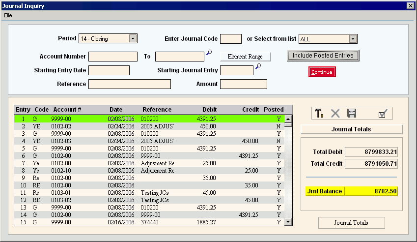 Use the General Journal Inquiry to view the journal entries for a specific Period. You can limit the displayed transactions by several selection criteria, including Account Number, Date, and Journal Code.