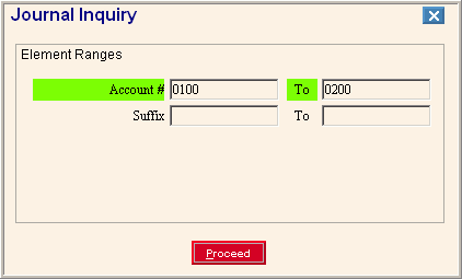 Element Range Prompt Tip: This prompt displays a list of the Elements defined for the Account Number. The list of elements varies according to the settings for each facility. You can select accounts to display by entering ranges of Elements. | |
