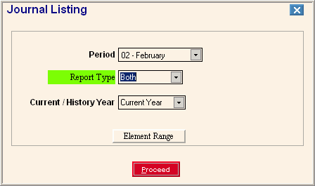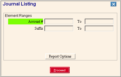 General Journal Listing - Element Range Tip: This prompt displays a list of the Elements defined for the Account Number. The list of elements varies according to the settings for each facility. You can select accounts to print on the report by entering ranges of Elements. | |