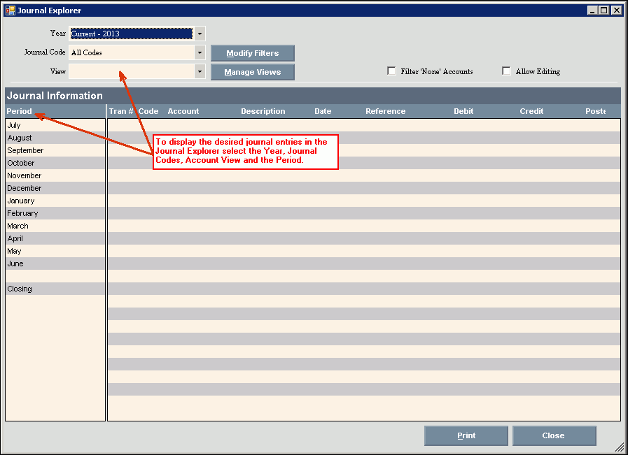 Use the Journal Explorer to quickly and easily view the General Ledger journal transaction details for a given time period. To limit the journal entries that display, you can specify the year, period, types of journal entries and Account View. The Journal Explorer settings that you maintain can be saved and used again. In addition, you can drill-down to view the Cash Receipts or Expense detail for journal entries marked with a code of C, R, I or P. And, you have the option of printing the journal information as well as exporting it to Excel or other third-party productivity tool.