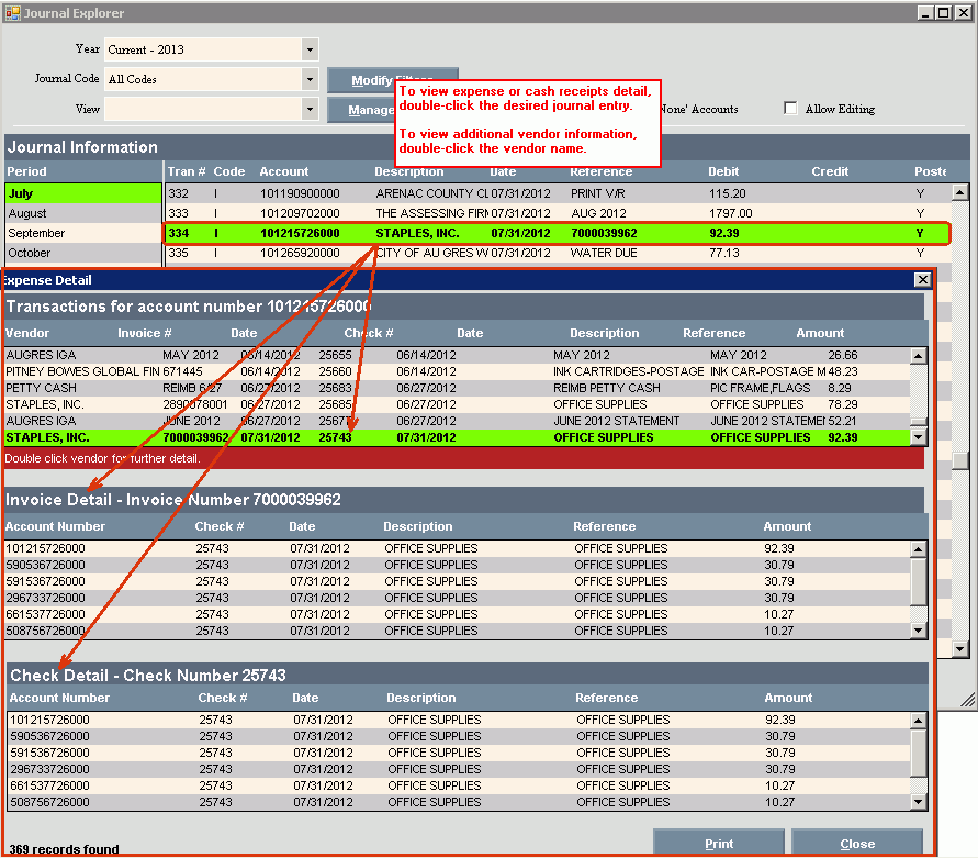 To view the Expense or Cash Receipts Detail associated with a journal entry, double-click a journal item with a code of C, R, I or P and a Expense or Cash Receipts Detail window displays. Below is an example of the Expense Detail window: Then, double-click a specific entry, to display the associated invoice and check detail information.
