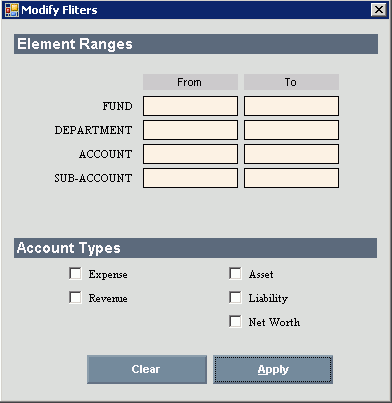 To further narrow down the search, click Modify Filters. This allows you to enter a range of funds, departments, account or sub-accounts, as well as, a specific account type to include or exclude on the Journal Explorer. Tip: When you specify filters, the message Filter On displays to alert you. |