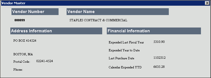 To view additional Vendor Master information, double-click the desired vendor and a window similar to the following displays: