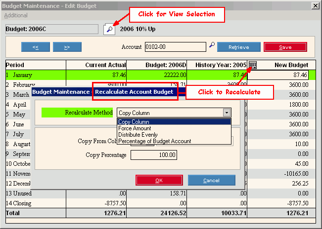 To recalculate the Budget Amounts for the displayed Account Number, click Calculator, which displays the Recalculate Account Budget Window. Tip: For more information see the Recalculate Account Budget Window Prompts section later in this topic. |