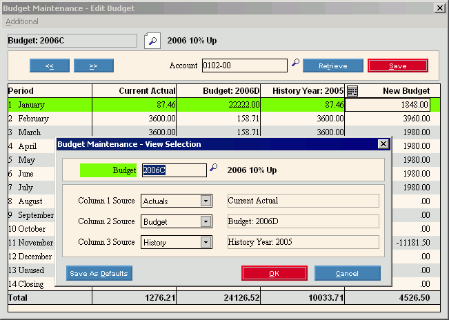 Use Budget Maintenance to edit budget information and to compare a budget to other data sources such as the current Chart of Accounts, history and other budgets.