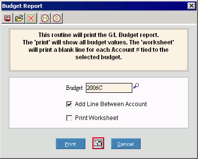Use the Budget Report to print each account's Budget Amount for each Period of a specified Budget. You can optionally print a worksheet used to manually write in Budget Amounts.