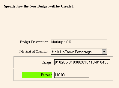 Tip: This field appears only if you specified the Mark up/Down Percentage Budget Creation Method. | |