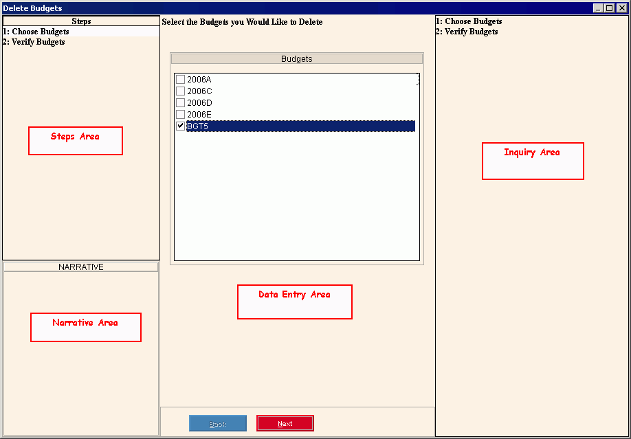 Use the Delete Budgets wizard to delete budget information. You can delete as many budgets at once as necessary.