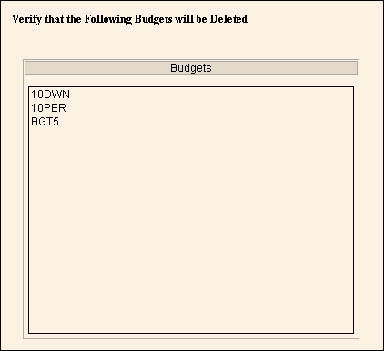 Displays a list of the budgets that you selected for deletion. Note: Before continuing, confirm that the list is correct. |
