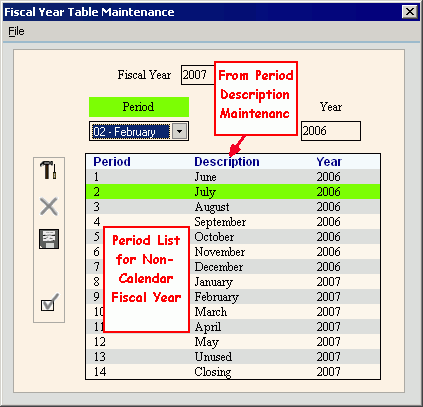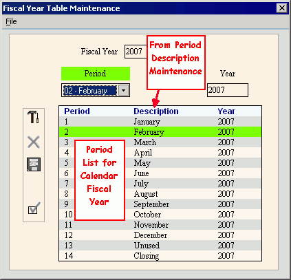 Use Fiscal Year Table Maintenance to assign each calendar month of the Fiscal Year to a specific Period. If your Fiscal Year coincides with your Calendar Year, then the month coincides with the Period Number. However, if your Fiscal Year begins in a month other than January, then each fiscal period reflects the appropriate month by displaying the Period Description maintained during Period Descriptions Maintenance.