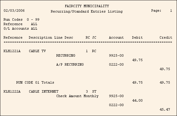 To see instructions for running the report shown below, see the Recurring-Standard Entries Listing Instructions.