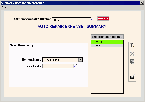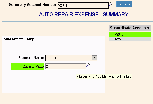Example A: To roll up all Auto Repair Expenses for all departments to one account: 1. Enter the Summary Account Number, 789-0. The first Element is the account and the second is the Suffix, which indicates the department. 2. Specify the Element; in this case Element 2 for the department Suffix. 3. Enter