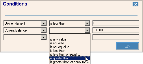Search Conditions are criteria that you specify to limit the number of records displayed in the Search list.  For example, you can set up conditions to display only the accounts with a balance greater than $100.