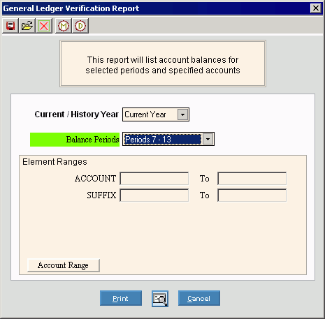Use the General Ledger Verification Report to compare the Period Balances for an account. You can see columns for each Account Number including a range of the first six Periods or the last seven Periods of the year, and account totals. You can specify to print the report for the current Fiscal Year or for a year in history, and you can limit the accounts on the report by Account Element.