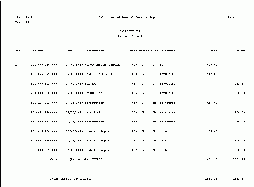 To see instructions for running the report shown below, see the Unposted Journal Entries Report Instructions.