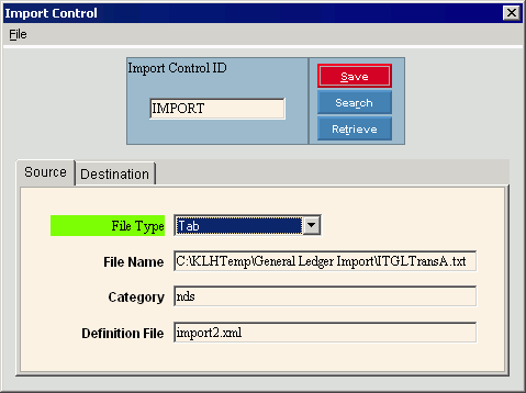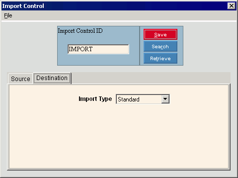 To display an existing Import Control Record, enter the Import Control ID and click Retrieve, or press [ENTER]. Keyboard shortcut: [ALT + t] |