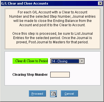 The routine initializes the specified Period before generating the clear and close transactions, which are assigned to Journal CodeG.