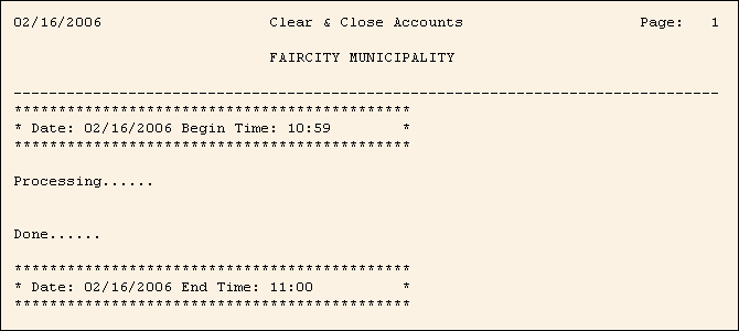 To see instructions for running the report shown below, see Clear and Close Accounts.