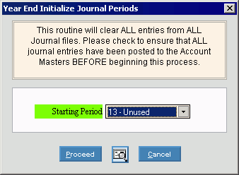 Use the Initialize Journal Period - Year-End routine to clear all transactions for a string of Periods and copy the transactions to history. You only need to specify the starting Period and all of the following Periods will be initialized. A confirmation report prints when you are done. You can use this routine when preparing to enter transactions for a new Fiscal Year, especially after you have closed the previous year and are ready to initialize any Periods not already initialized.