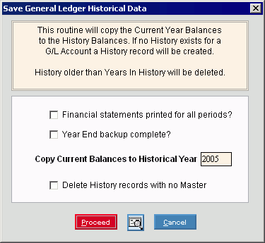 Use the Save Historical Data routine during Year-End processing to copy the Balances from the current Chart of Accounts to the history file for the closing Fiscal Year. This also copies journal entry transactions to history. The total number of years that can be stored in history is determined by the parameter setting established during installation at the Application Option Parameters.
