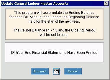 Use the Update Master Accounts routine during year-end to roll the calculated Account Ending Balances from the closing Fiscal Year into the Beginning Balances of the new Fiscal Year. This routine also increments the Period Closing Date by one year and sets the Period Balances for all Periods to zero.
