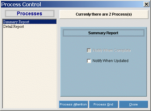 The Process Control program, also referred to as Process Options, allows you to control how you are informed of the status of certain functions or processes in Invision™. A process is a program function that runs in the background and performs operations that require only minimal interaction with the user. With this program you can direct the system to display a notice when a function is complete or updated. The Process Control dialog box is used to select the process and to control the status information desired.