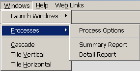 The Processes menu contains a list of processes that are currently active in addition to the Process Control Options command.  A process is a program function that runs in the background and performs operations that require only minimal interaction with the user.  A process may take several minutes when accessing large files.