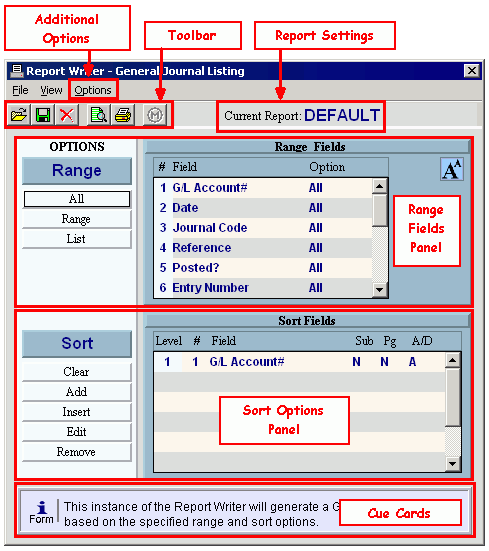 The report writer is a powerful tool that lets you tailor a report by limiting the range of included records and by specifying the sort options. After defining the options, you can save the settings with a specific name for each set that you define. You can reuse any settings that you have already defined and saved. The table below provides links to topics that describe the Report Writer features in detail.