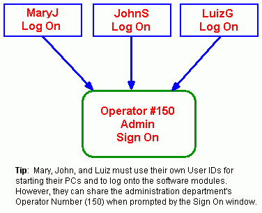 Do not confuse the Sign On Operator Number with the Log On User ID. You must enter the User ID to log onto the module. However, the Operator Number is not required by all facilities. Each user must have a unique User ID, however it is possible for users to share Operator Numbers.