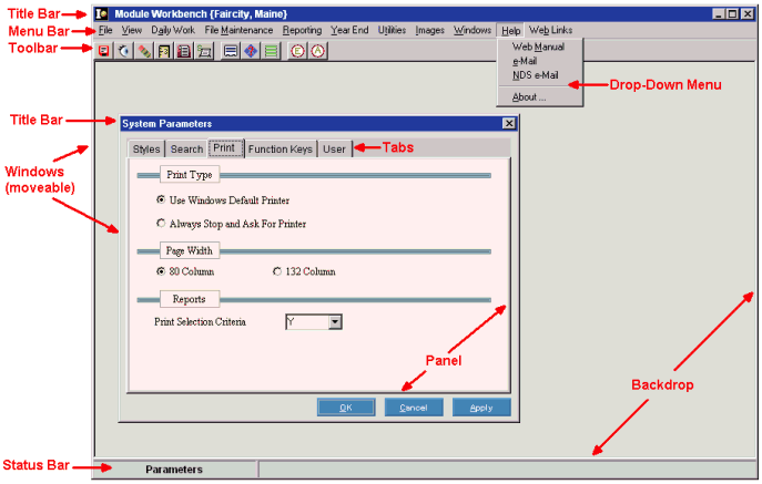 Window: An area within the screen, which can be resized and can be moved by dragging the Title Bar.