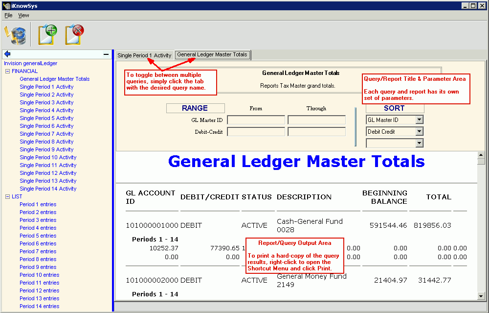 General Ledger iKnowSys - Report/Query Panel Window Example: