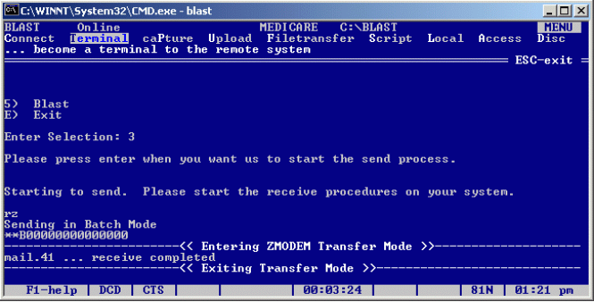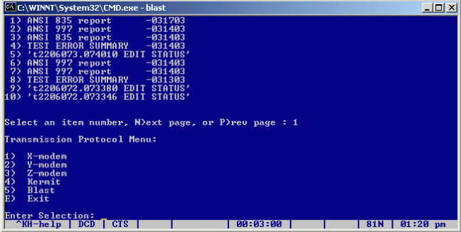 Use the Electronic Billing Receive Log routine to retrieve the electronic billing transmission logs from the insurance carrier. The Receive Logs provide an audit trail that you sent the electronic billing file to the carrier. The Receive Log routine will launch BLAST or other communications software and automatically log into insurance carrier's website (Anthem, for example) and check for the report dates that match the transmissions that you have sent. After you select the option to download the Receive Log to your communications PC, and you log off, INSight will automatically upload the carrier Receive Log to the appropriate place on your system. Once the Receive Log routine is completed and the Logs are uploaded you will need to return to the Review Log routine to view the uploaded receive reports.
