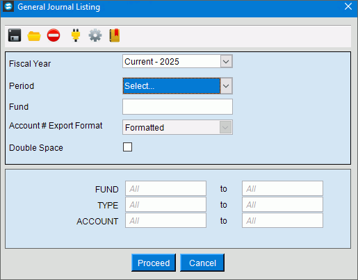 General Journal Listing Report Options Window: Tip: This appears after the Report Writer screen.