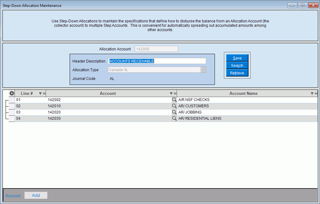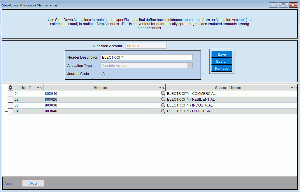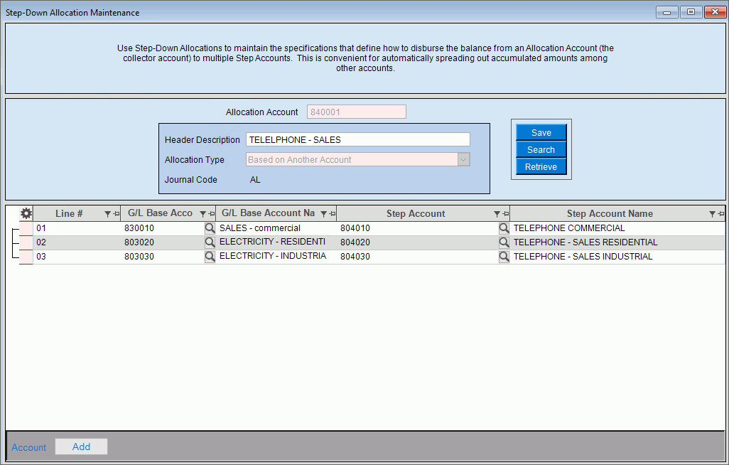 A Step-Down Allocation is a method for automatically disbursing the Period Balance from a "collector" Allocation Account among other accounts, called the Step Accounts. Various distribution methods are allowed, including by percentage, amount, and based on another account. Examples for using allocations include disbursement of office supplies and utility bills among departments.