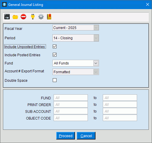 Print Adjustments Journal Use the Print Journal to generate a adjusting entries list for period 14. You can select if you want to see posted or unposted transactions. To run the journal, click Print Journal. The following screen displays.