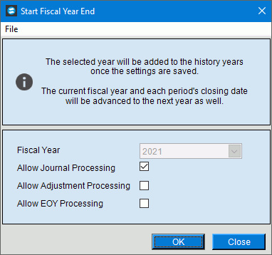 Use the Start Fiscal Year End to begin the fiscal year end. Start fiscal Year end will save the selected year to the history years. And the current fiscal year and each period's closing date will be advanced to the next year as well. There are options to control entries being made in prior years that you can select if desired.